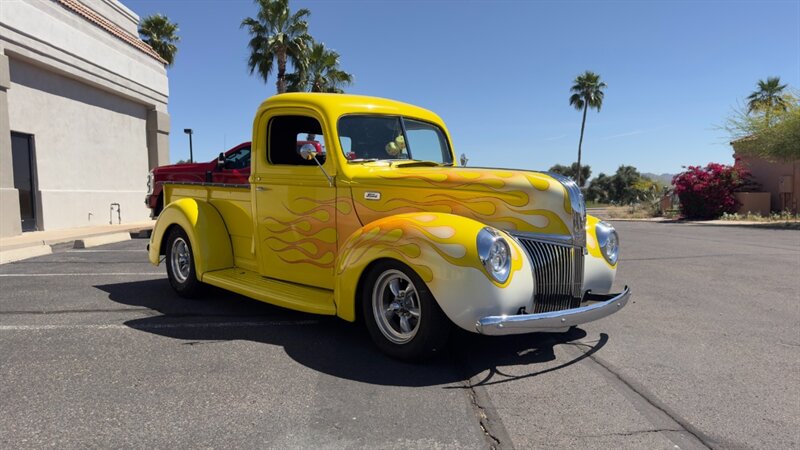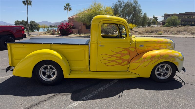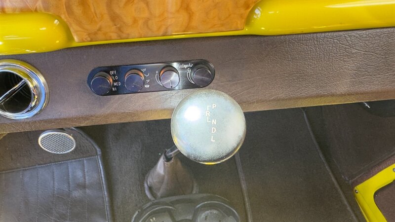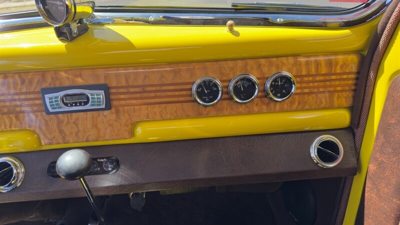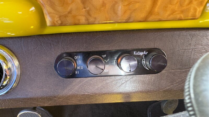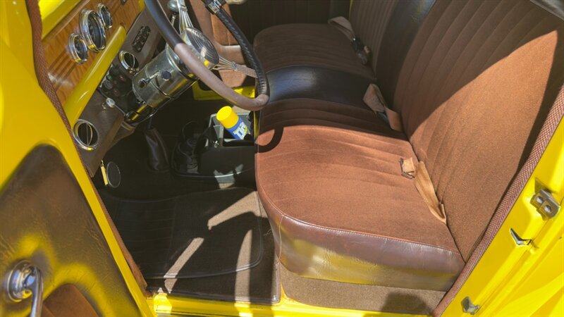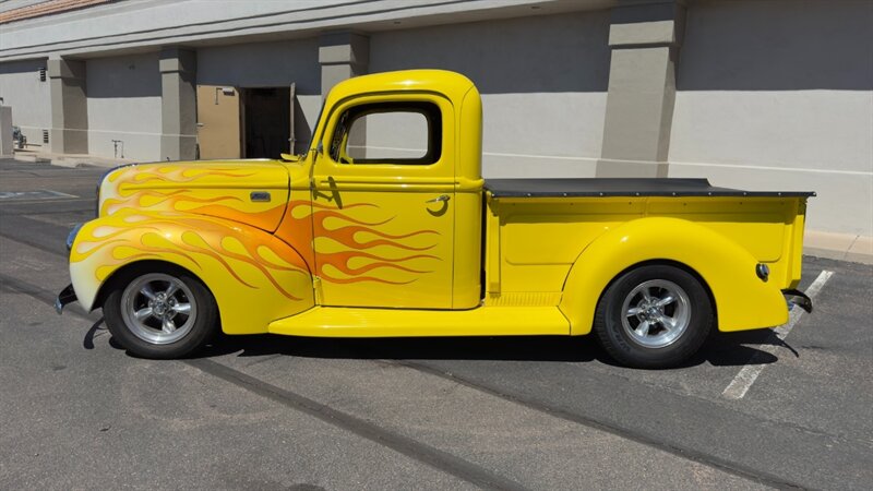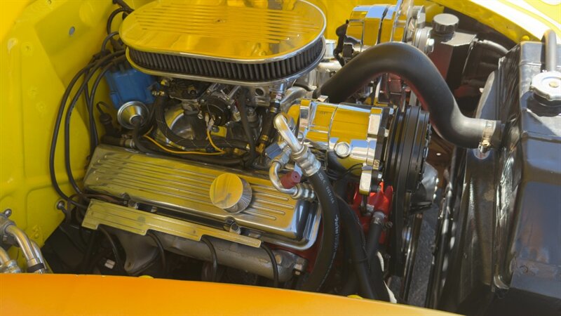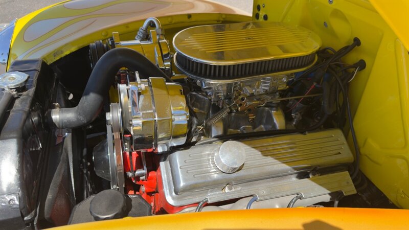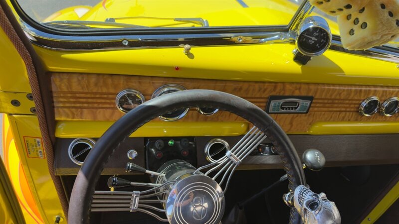 The 1941 Ford pickup represents a pivotal moment in blue-collar American design. Moving away from the barrel-grille styling of the late 1930s, the ’41 introduced a wider, more integrated, and substantially more modern front fascia that immediately captured the imagination of the public. Today, those sweeping lines and prominent fenders make it a quintessential canvas for traditional hot rodding. The example offered here is a beautifully executed custom that honors its vintage roots while integrating thoughtful upgrades for modern drivability and comfort. The exterior makes an immediate and unforgettable statement. Finished in a brilliant bright yellow, the paint is accented by striking pearl flames that dance across the front end. The foundation is robust, featuring an all-steel body and front fenders, paired with fiberglass rear fenders that beautifully accommodate the widened stance. Rolling on a classic set of American Racing Torq Thrust wheels, this truck perfectly nails the nostalgic street rod aesthetic. The build is further protected and refined by a front bra nose cover for highway cruising and a sleek tonneau cover to secure the bed. True to time-honored hot rod philosophy, the powertrain relies on classic Chevrolet engineering. Under the hood sits a snappy 283-cubic-inch Chevy V-8 breathing through a 4-barrel carburetor. It sends power through a reliable 2-speed Powerglide automatic transmission back to a stout Chevy Nova rear end. Cooling is expertly handled by a premium Walker radiator paired with a Cooling Components electric fan, ensuring the engine runs at the optimal temperature even in modern traffic. The authentic hot rod stance and handling are achieved through a dropped front axle with split wishbones and a transverse multi-leaf spring, while the rear utilizes a parallel leaf setup. Gas shocks at all four corners smooth out the ride, and a front disc brake conversion ensures it stops with confidence. Inside the cab, vintage charm meets dedicated cruising comfort. The focal point is a beautiful Wabbitt Woodworks custom dash, elegantly housing a full suite of Stewart-Warner gauges, while a period-correct Moon Eyes tachometer monitors the revs. The cabin is trimmed in a tasteful combination of brown Naugahyde vinyl and cloth. The builder thoughtfully integrated modern conveniences to make this ’41 a joy to drive in any weather, including an electric cowl vent, a tilt steering column, and a fully integrated Vintage Air A/C and heating system. This Ford is a fully dialed-in, turn-key street rod ready for local shows and weekend cruising alike.