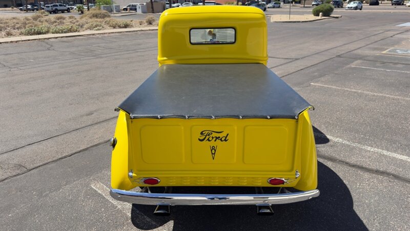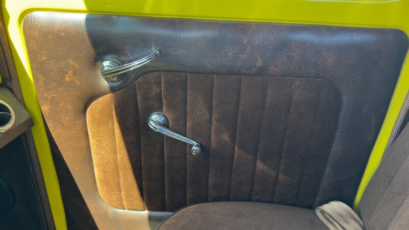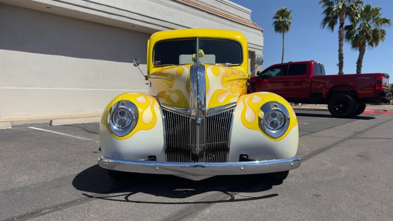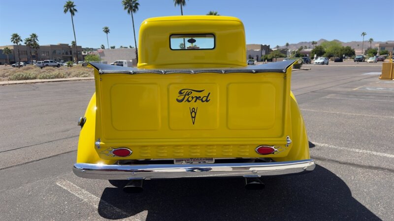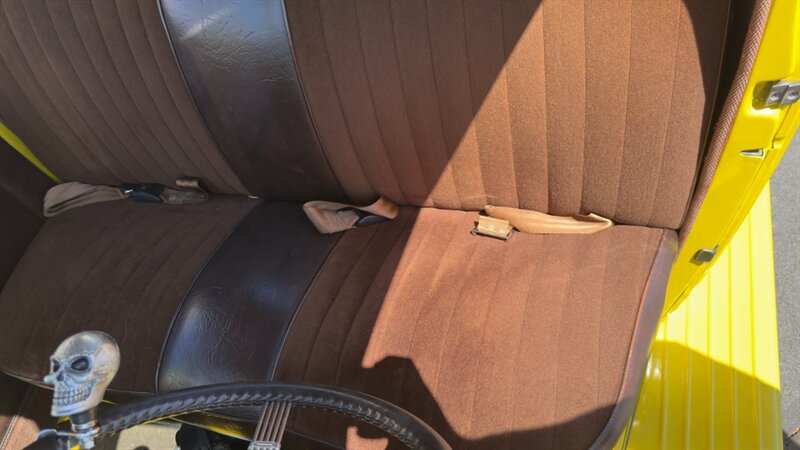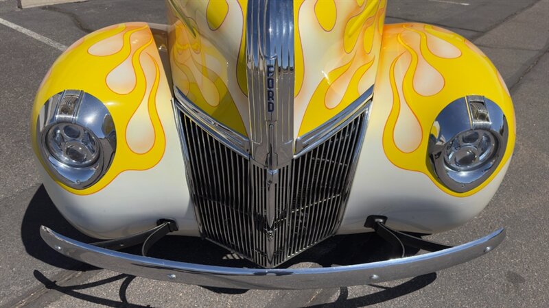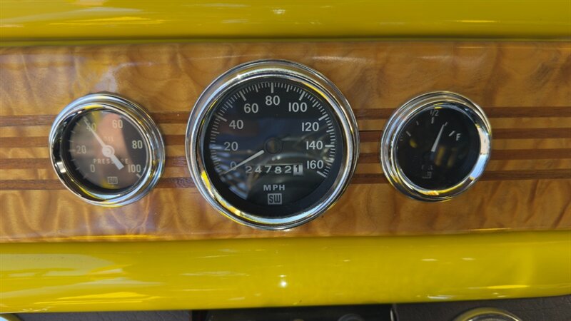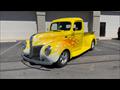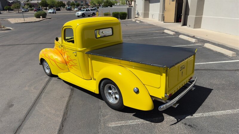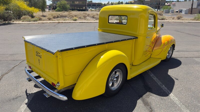 The 1941 Ford pickup represents a pivotal moment in blue-collar American design. Moving away from the barrel-grille styling of the late 1930s, the ’41 introduced a wider, more integrated, and substantially more modern front fascia that immediately captured the imagination of the public. Today, those sweeping lines and prominent fenders make it a quintessential canvas for traditional hot rodding. The example offered here is a beautifully executed custom that honors its vintage roots while integrating thoughtful upgrades for modern drivability and comfort. The exterior makes an immediate and unforgettable statement. Finished in a brilliant bright yellow, the paint is accented by striking pearl flames that dance across the front end. The foundation is robust, featuring an all-steel body and front fenders, paired with fiberglass rear fenders that beautifully accommodate the widened stance. Rolling on a classic set of American Racing Torq Thrust wheels, this truck perfectly nails the nostalgic street rod aesthetic. The build is further protected and refined by a front bra nose cover for highway cruising and a sleek tonneau cover to secure the bed. True to time-honored hot rod philosophy, the powertrain relies on classic Chevrolet engineering. Under the hood sits a snappy 283-cubic-inch Chevy V-8 breathing through a 4-barrel carburetor. It sends power through a reliable 2-speed Powerglide automatic transmission back to a stout Chevy Nova rear end. Cooling is expertly handled by a premium Walker radiator paired with a Cooling Components electric fan, ensuring the engine runs at the optimal temperature even in modern traffic. The authentic hot rod stance and handling are achieved through a dropped front axle with split wishbones and a transverse multi-leaf spring, while the rear utilizes a parallel leaf setup. Gas shocks at all four corners smooth out the ride, and a front disc brake conversion ensures it stops with confidence. Inside the cab, vintage charm meets dedicated cruising comfort. The focal point is a beautiful Wabbitt Woodworks custom dash, elegantly housing a full suite of Stewart-Warner gauges, while a period-correct Moon Eyes tachometer monitors the revs. The cabin is trimmed in a tasteful combination of brown Naugahyde vinyl and cloth. The builder thoughtfully integrated modern conveniences to make this ’41 a joy to drive in any weather, including an electric cowl vent, a tilt steering column, and a fully integrated Vintage Air A/C and heating system. This Ford is a fully dialed-in, turn-key street rod ready for local shows and weekend cruising alike.