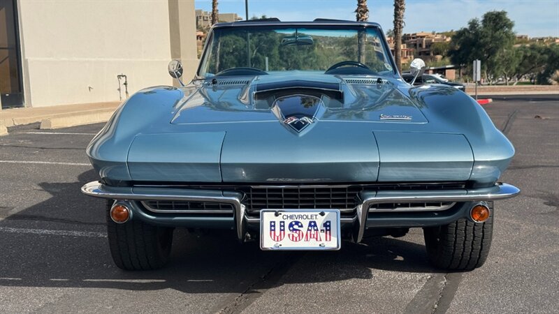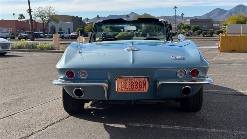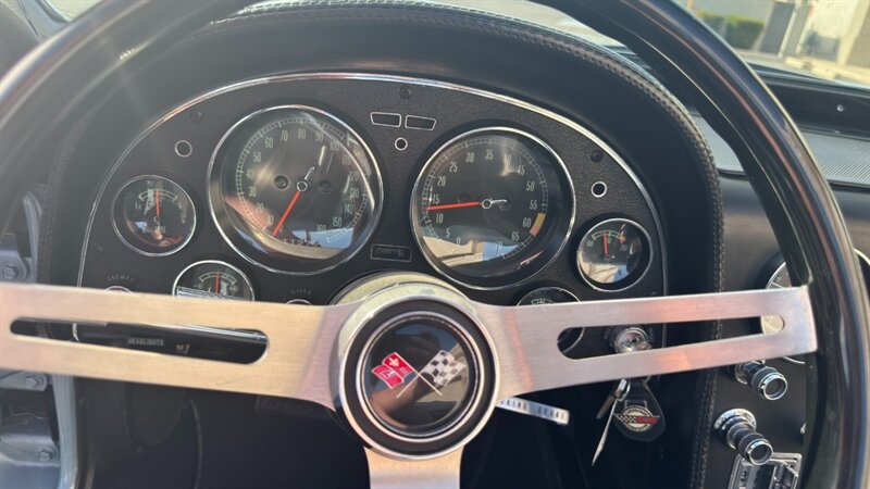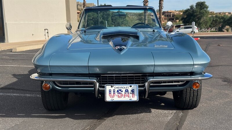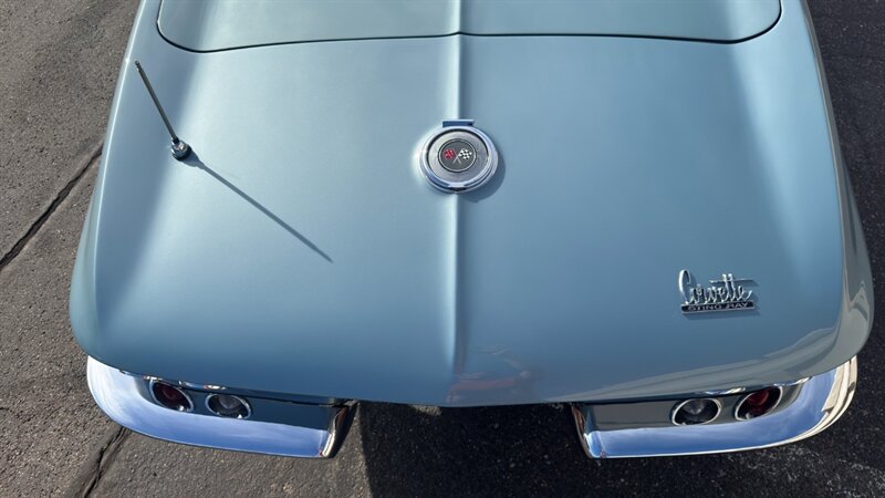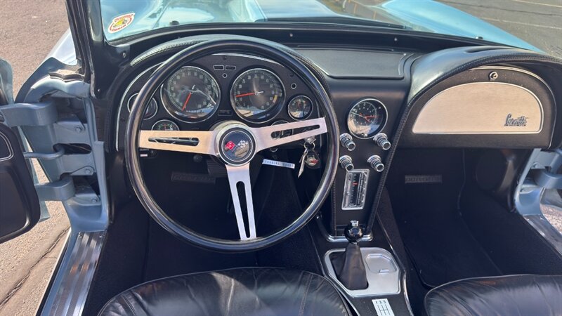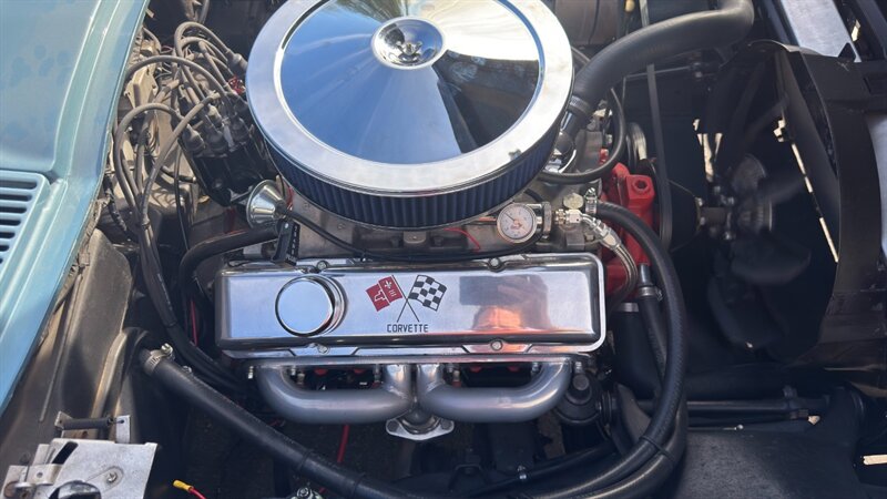 The C2 Generation Corvette, immortalized as the "Sting Ray," stands as one of the most significant triumphs in American automotive design. With its wind-tunnel-tuned curves and independent rear suspension, it was the moment the Corvette matured from a fiberglass roadster into a genuine world-class sports car. The 1966 model year is particularly revered for refining this formula, offering a balance of aggression and elegance that few cars have matched since. This particular example takes that iconic silhouette and injects it with a "day two" attitude, blending the timeless lines of the mid-60s with a powertrain selected for modern driveability and visceral acoustic feedback. The cocktail gets more potent when you examine the mechanical specification. While it retains the spirit of the original small block, the engine bay is now home to a 350-cubic-inch crate V-8, breathing deeply through a Holley 4-barrel carburetor and a Weiand intake manifold. The soundtrack is uncorked via McJacks shorty headers feeding into unmistakable side pipes—a setup that provides the visual and auditory drama that defines the muscle car era. Crucially, the driving experience has been modernized for highway touring; the V-8 is backed by a 700R4 4-speed automatic transmission, offering an overdrive gear that transforms this Corvette from a quarter-mile sprinter into a comfortable long-distance cruiser. Cooling is managed by a BeCool aluminum radiator, while handling and stopping are refined by power steering and four-wheel disc brakes. The example offered here is finished in brilliant Laguna Blue, a hue that perfectly accentuates the Sting Ray’s complex surfacing. The exterior aggression is dialed up with the addition of a 1967-style Big Block hood, highlighted by a sharp black "stinger" stripe that draws the eye from the nose to the cowl. Paint is considered in excellent condition with brilliant luster. On a scale to ten, we rate this paint as a solid 9. This Sting Ray rides on 15-inch American Racing aluminum wheels wrapped in BFG Radial T/A rubber, giving it a low, purposeful stance. The look is capped by a like-new white canvas convertible top that provides a crisp contrast to the bodywork. Inside, the cabin remains true to its roots with a Code 418 Black vinyl interior. The bucket seats, door panels, and dash are clean and well-preserved, maintaining the focused, cockpit-style layout the C2 is famous for. A center console anchors the space, and while the shifter may visually suggest a manual lineage, it commands the automatic transmission with ease. Rounded out by a classic AM/FM radio, this Corvette offers the best of both worlds: the undeniable curb appeal of a side-pipe Sting Ray with the effortless usability of a sorted, automatic cruiser.